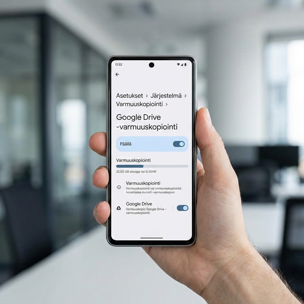 Ota Google Backup käyttöön: Mene Asetukset → Järjestelmä → Varmuuskopiointi (tai Asetukset → Google → Varmuuskopiointi). Ota "Varmuuskopioi Google Driveen" tai "Back up to Google Drive" päälle. Valitse Google-tili, johon haluat varmuuskopioida.