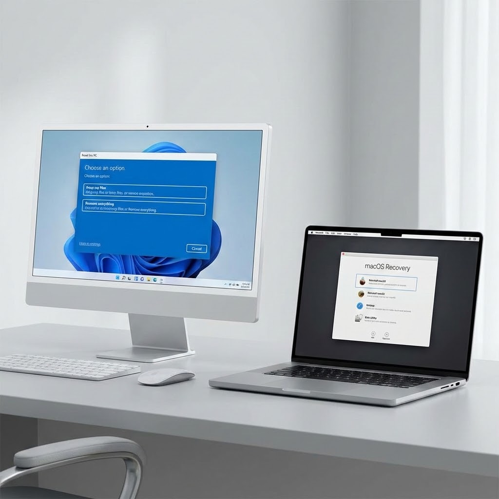 Windows 10 ja 11: Mene Asetukset → Järjestelmä → Palautus. Valitse "Palauta tietokone" tai "Palauta tämä tietokone". Valitse "Poista kaikki" varmistaaksesi että kaikki tiedostot poistetaan.